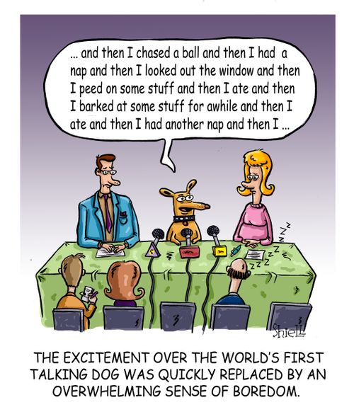 The mutt looks up and says, "Well, I discovered my gift of talking pretty young and I wanted to help the government, so I told the CIA about my gift, and in no time they had me jetting from country to country, sitting in rooms with spies and world leaders, because no one figured a dog would be eavesdropping. I was one of their most valuable spies eight years running.
